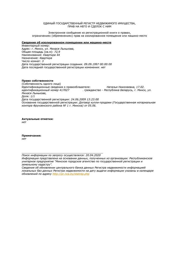 Стандартная выписка из реестра включает следующие данные: